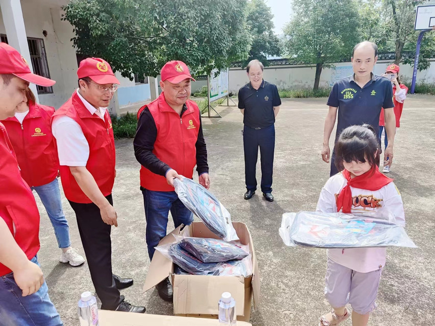 王明林志愿服務建工集團分隊一行與港溝小學王校長和教職員工進行座談,深入了解留守兒童學習、身體、生活等各方面狀況,并給在讀的16名兒童送上雙肩書包、夏秋季校服及籃球、文具、教學器材等配套文體用品。