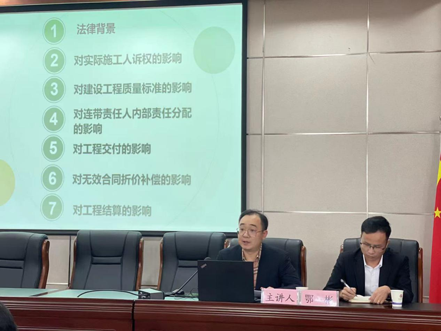 活動(dòng)邀請(qǐng)湖北易圣律師事務(wù)所鄂彬律師擔(dān)任主講,鄂律師從《民法典》對(duì)施工人員訴求、工程質(zhì)量標(biāo)準(zhǔn)、內(nèi)部責(zé)任分配、工程交付、合同折價(jià)補(bǔ)償、工程結(jié)算等六大影響作了深入淺出、生動(dòng)細(xì)致的講解,具有很強(qiáng)的針對(duì)性和實(shí)用性,使參加培訓(xùn)的人員收獲頗深。
