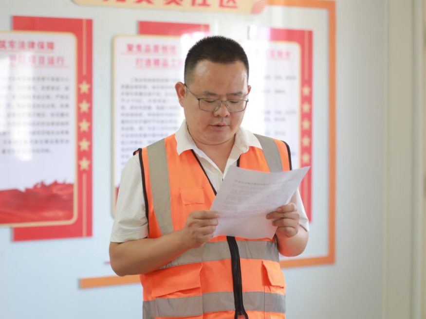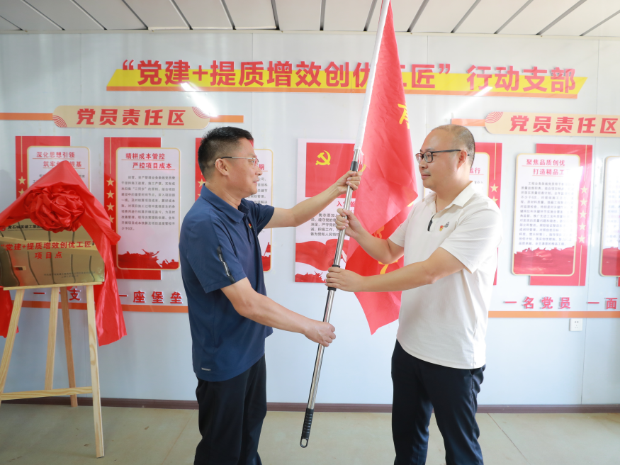 隨后,建工集團機關(guān)黨支部開展“能工巧匠”黨建品牌活動,學習宣貫了清廉項目清風工匠行動、青年突擊攻堅工匠行動和提質(zhì)增效創(chuàng)優(yōu)工匠行動實施方案。王鵬同志帶領(lǐng)全體黨員宣讀了廉潔從業(yè)誓詞,崔巍同志和呂成芳同志分別為項目廉潔監(jiān)督員頒發(fā)聘書,廉潔監(jiān)督員代表作了履職承諾。建工集團機關(guān)支部舉行了“建工集團青年先鋒突擊隊”授旗儀式,洪登峰同志將隊旗授予青年先鋒突擊隊隊長。最后全體黨員按照黨員責任區(qū)分工檢查了項目安全、進度、質(zhì)量、經(jīng)營、物資管理、法律風險的情況,并與項目部深入交流,提出改進措施和意見。