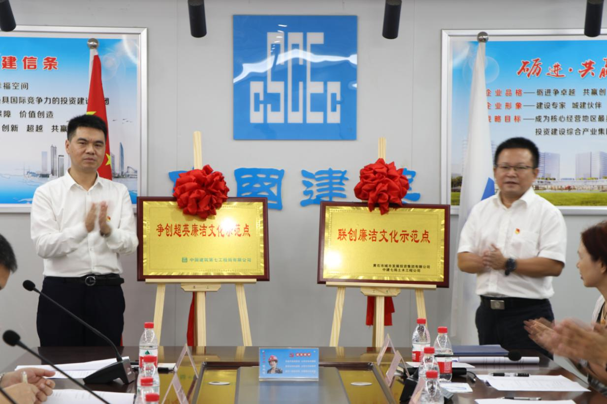 啟動儀式上,觀看了習近平總書記“七一”講話視頻、《向城而生》宣傳片、陳超英事跡新聞《時代先鋒:陳超英》。宣讀了“超英廉潔文化示范點”聯創(chuàng)共建實施方案。聯創(chuàng)共建“三方”紀委書記共同簽訂《“超英廉潔文化示范點”聯創(chuàng)共建協(xié)議書》。集體宣讀廉潔從業(yè)誓詞、向廉潔監(jiān)督員頒發(fā)聘書,為奮斗在項目一線的黨員、管理人員和青年代表授旗,為項目部“廉潔書屋”贈送廉潔文化書籍。隨后,在熱烈的掌聲中,黃訓能、李艷志共同為項目“爭創(chuàng)超英廉潔文化示范點”“聯創(chuàng)廉潔文化示范點”揭牌。